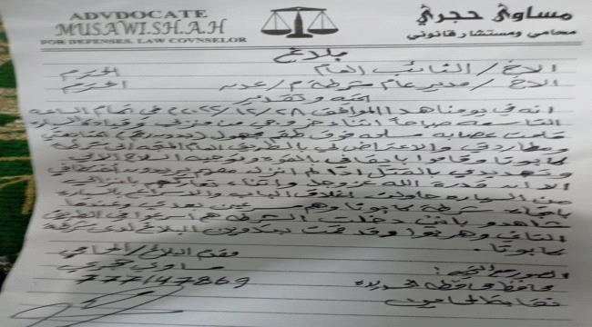 وقال حجري في بلاغ للنائب العام للجمهورية ومدير عام شرطة محافظة عدن، إنه تعرض لمحاولة اختطاف من قبل مجموعة مسلحة مجهولة على متن طقم عسكري اعترضوا سيارته بعد خروجه من منزله.