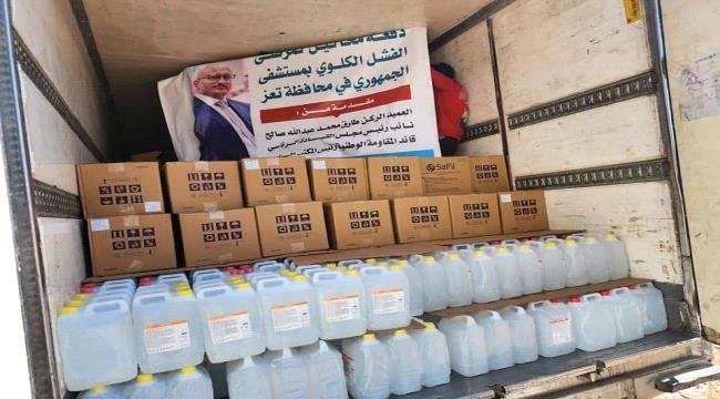 وتكفل العميد الركن طارق صالح بدعم مركز الغسيل في المستشفى الجمهوري بمحافظة تعز بدفعة من المحاليل الخاصة بمرضى الفشل الكلوي، حيث تحتوي الشحنة على ألفي جلسة غسيل والتي من شأنها إنقاذ حياة المئات من مرضى الفشل الكلوي.