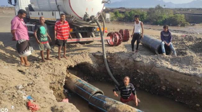 تقوم فرق المنطقة الثانية بالمؤسسة المحلية للمياه والصرف الصحي بمحافظة عدن بإجراء أعمال صيانة في أنبوب خط المياه الرئيسي قطر 24 انش بالقرب من جولة كالتكس في مديرية المنصورة.