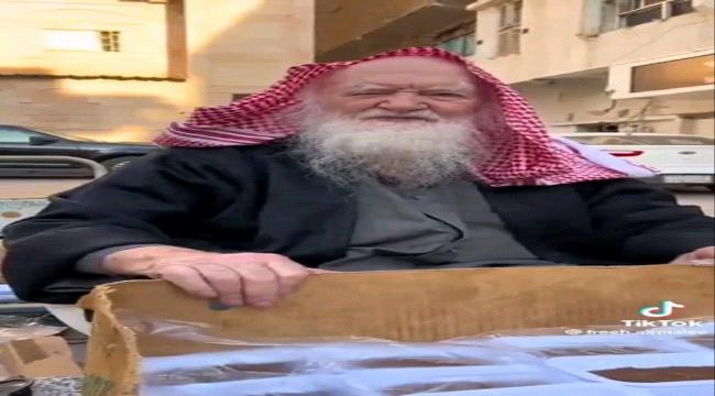 ورصد الفيديو، إقبال عدد من الأشخاص على المسن الذي يبلغ عمره 95 عاماً وابنه بجانبه، كما ظهروا يأخذون منهم الخبز والتمر.