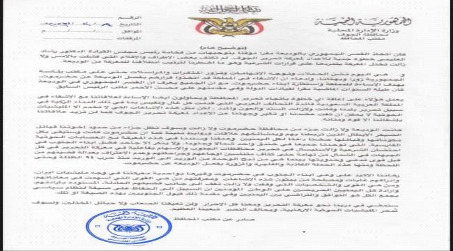 مكتب محافظ الجوف يصدر بيانا هاما بشأن هذا الامر