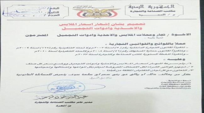أصدر مكتب وزارة الصناعة والتجارة بمحافطة المهرة تعميماً، بشأن إشهار أسعار الملابس والأحذية وأدوات التجميل موجهاً للتجار والمحلات.