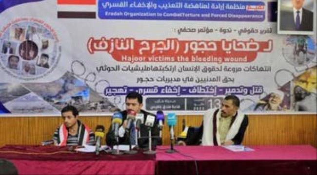 وحمّلت المنظمة ميليشيا الحوثي مسؤولية حياة المختطفين والمخفيين قسرا، مؤكدة أن جرائم الميليشيا بحق أبناء حجور "جرائم حرب لن تسقط بالتقادم".