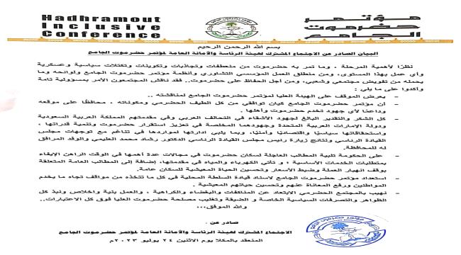 مؤتمر حضرموت الجامع يصدر بيان مهم في ختام لقاء رئاسته والأمانة العامة