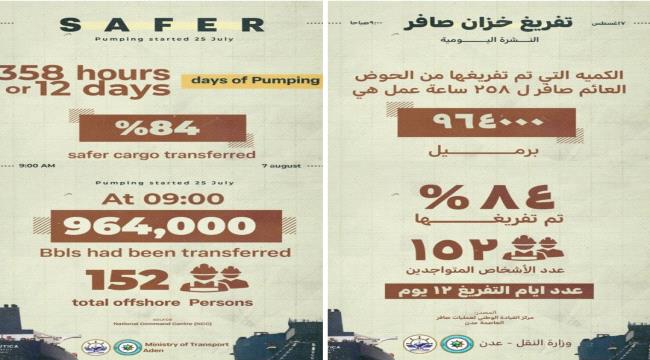 واوضحت وزارة النقل في صفحتها الرسمية عن الهيئة العامة للشئون البحرية ، بان اجمالي الكمية التي تم تفريغها حتى يومنا هذا تصل لنحو 84% من اجمالي الكمية الموجودة في خزان صافر ، بينما كان اجمالي عدد الاشخاص المتواجدين اثناء عملية التفريغ نحو 152شخصاً ، بينما وصلت عدد ايام التفريغ حتى يومنا هذا منذ بدء عملية التفريغ نحو 12 يوماً .