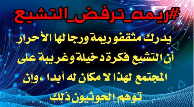 أطلق ناشطون في محافظة ريمة حملة شعبية إلكترونية بعنوان "ريمة ترفض التشيع" وذلك للاحتجاج على ممارسات مليشيا الحوثي الإرهابية في المحافظة.