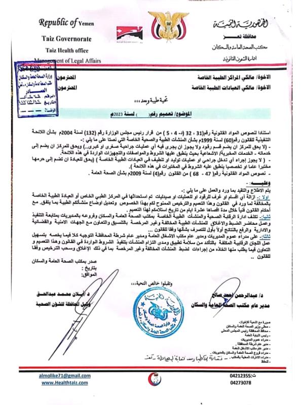 وتخاطب الوثيقة كل من مالكي المراكز الطبية الخاصة، ومالكي العيادة الطبية الخاصة في محافظة تعز، في تاريخ 22 أغسطس الجاري، إزالة أي أقسام أو غرف للرقود أو العمليات أو للصيدليات المستحدثة في المراكز والعيادات الطبية الخاصة، والتي تعد مخالفة لقانون المنشآت الطبية والصحية الخاصة رقم (60) لسنة 1999، ولائحته التنفيذية، والقانون رقم (4) لسنة 2009 بشأن الصحة العامة.
