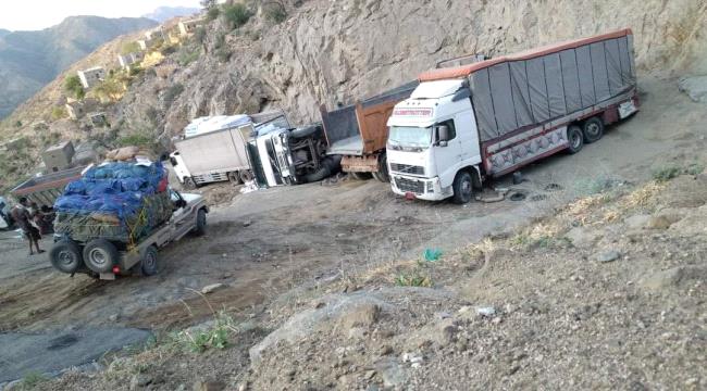 شهد الطريق الرابط بين محافظتي تعز وعدن، صباح اليوم الإثنين، حادث انقلاب شاحنة محملة بالأقمشة، ما تسبب في خسائر باهظة.