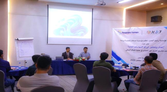 نفذت مؤسسة انسجام للتنمية السبت ورشة عمل حول إعداد وتحليل اوراق السياسات العامة للمكونات الشبابية والباحثين في العاصمة عدن, بدعم مؤسسة رنين اليمن, ضمن مشروع تعزيز دور الشباب في عملية السلام المحلي وإشراكهم في صناعة القرار على المستوى المحلي والوطني.