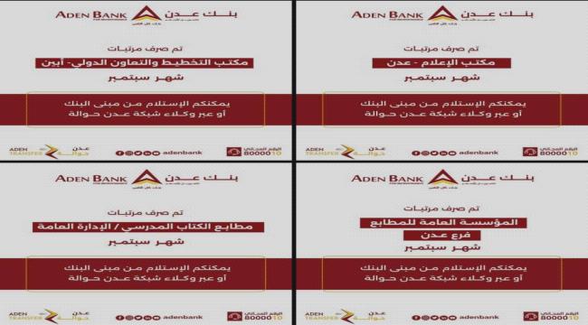 ويمكن استلام المرتبات عبر المركز الرئيسي للبنك في شارع التسعين بالعاصمة عدن، أو عبر شبكة البنك #عدن_حوالة أو نقاط الصرف التابعة للبنك.