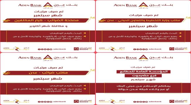 وبحسب إعلان بنك عدن للتمويل الأصغر فإنه يمكن لموظفين المرافق المعلن عنها استلام مرتباتهم من مبنى البنك أو عبر أي وكيل لشبكة #عدن_حوالة.