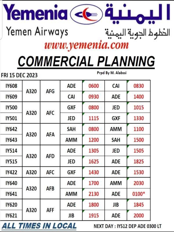 طيران اليمنية ليوم الجمعة - 15 ديسمبر 2023م