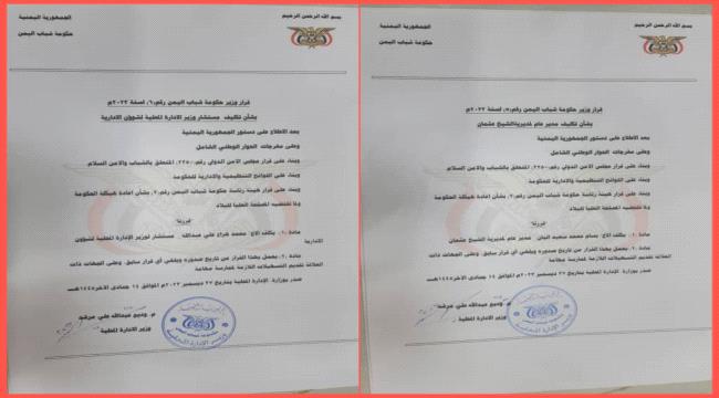 إضافة إلى إصدار قرارات تكليف عدداً من المستشارين لوزير الإدارة المحلية في حكومة شباب اليمن.