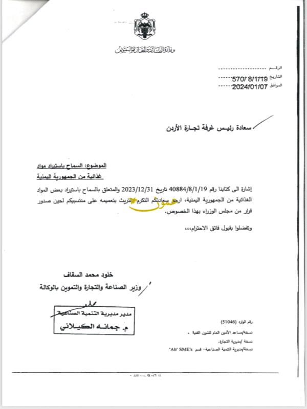 طلبت وزارة الصناعة والتجارة الأردنية من التجار التريث باستيراد بعض المواد الغذائية من اليمن، وذلك عطفًا على قرار سابق بالسماح باستيراد بعض المواد الغذائية.