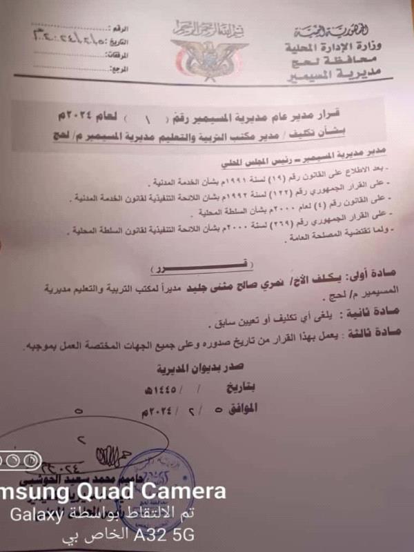 - مادة أولى: يكلف الأخ / نمري صالح مثنى جليد الرباكي مديرا لمكتب التربية والتعليم بمديرية المسيمير محافظة لحج.