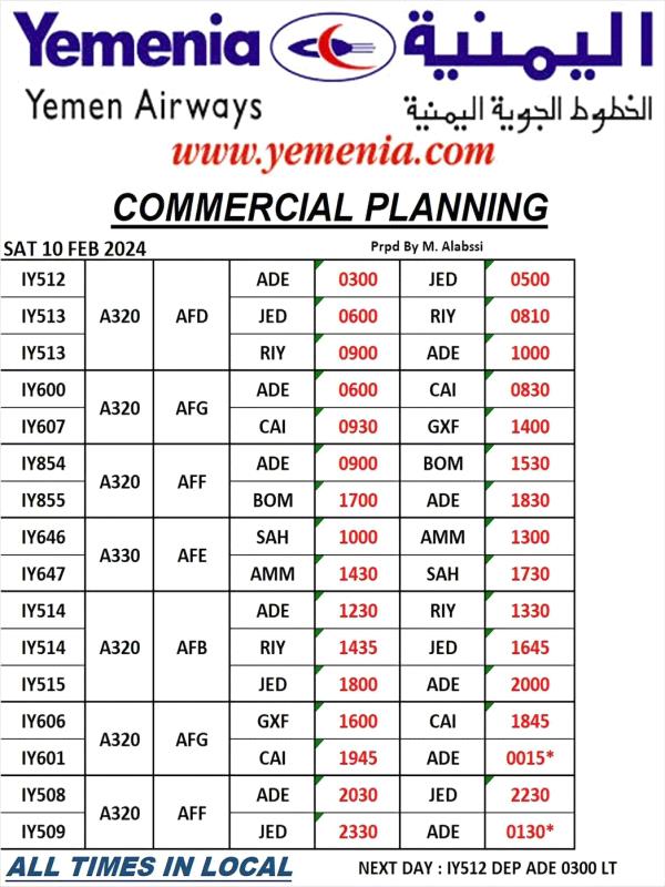 مواعيد رحلات طيران اليمنية ليوم غدٍ السبت - 10 فبراير 2024م