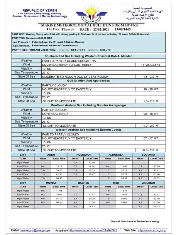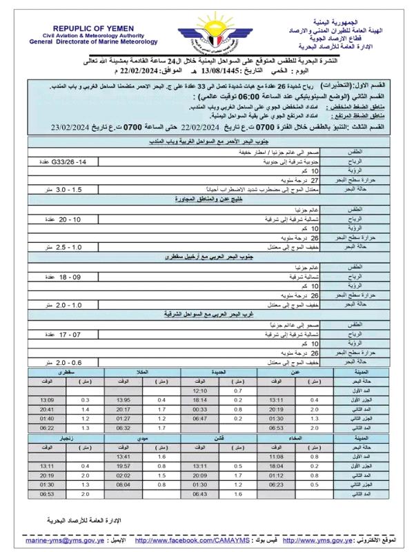النشرة البحرية المتوقعة على السواحل اليمنية للـ 24 ساعة القادمة