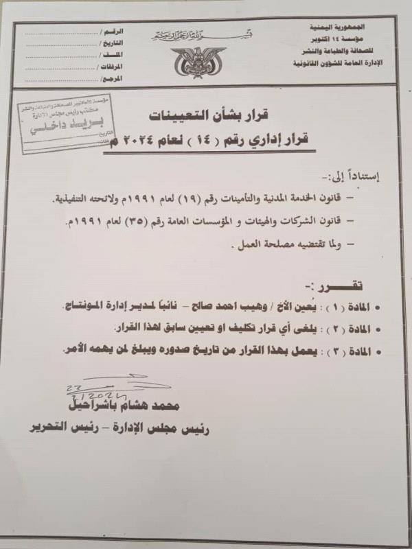 وقضى قرار إداري رقم (14) لسنة 2024 في مادته (١) بتعيين الأخ وهيب أحمد صالح .. نائبا لمدير إدارة المونتاج ، وقضت مادته(2) يلغي اي قرار تكليف أو تعيين سابق لهذا القرار