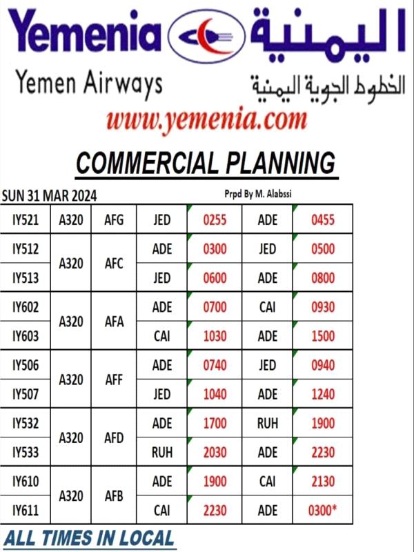 مواعيد رحلات طيران اليمنية ليوم الأحد - 31 مارس 2024م
