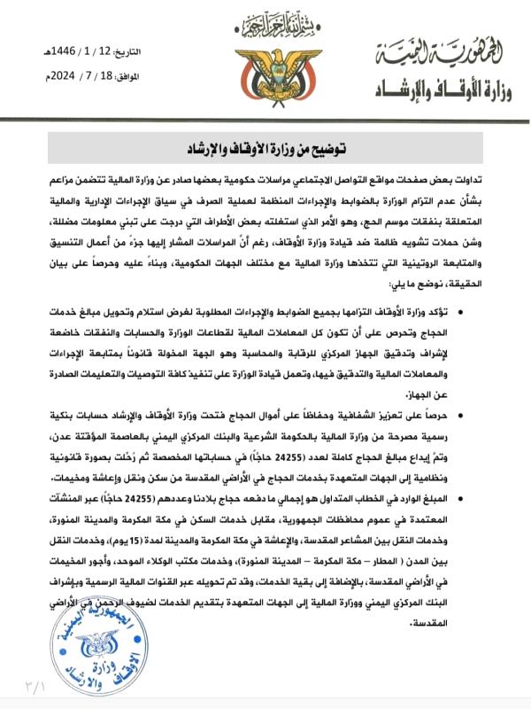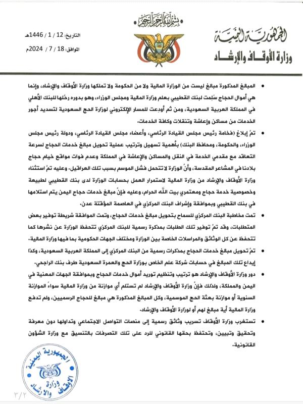 وبينت الوزارة أن المبلغ الوارد في الخطاب المتداول هو إجمالي ما دفعه حجاج بلادنا وعددهم (24255 حاجَّاً) عبر المنشآت المعتمدة في عموم محافظات الجمهورية، مقابل خدمات السكن في مكة المكرمة والمدينة المنورة، وخدمات النقل بين المشاعر المقدسة، والإعاشة في مكة المكرمة والمدينة لمدة (15 يوم)، وخدمات النقل بين المدن ( المطار – مكة المكرمة – المدينة المنورة)، وخدمات مكتب الوكلاء الموحد، وأجور المخيمات في الأراضي المقدسة، بالإضافة إلى بقية الخدمات، وقد تم تحويله عبر القنوات المالية الرسمية وبإشراف البنك المركزي اليمني ووزارة المالية إلى الجهات المتعهدة بتقديم الخدمات لضيوف الرحمن في الأراضي المقدسة...موضحة أن المبالغ ليست من الوزارة المالية ولا من الحكومة ولا تملكها وزارة الأوقاف والإرشاد، وإنما هي أموال الحجاج أودعت في الحساب المخصص لبرامج الحج طرف بنك القطيبي بعلم وزارة المالية ومجلس الوزراء، وهو بدوره رحَّلها للبنك الأهلي في المملكة العربية السعودية، ومن ثم أودِعت للمسار الإلكتروني لوزارة الحج السعودية لتسديد أجور الخدمات من مساكن وإعاشة وتنقلات وكافة الخدمات.