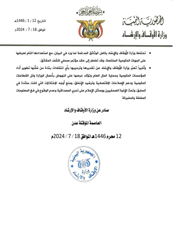 وفي البيان أكدت الوزارة أن المراسلات المشار إليها جزء من أعمال التنسيق والمتابعة الروتينية التي تتخذها وزارة المالية مع مختلف الجهات الحكومية، إلا أن بعض الأطراف وبعد أن فقدت مصالحها، درجت على تبني معلومات مضللة، وشن حملات تشويه ظالمة ضد قيادة وزارة الأوقاف.