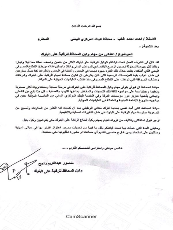 حيث طلب منصور راجح وكيل البنك المركزي لقطاع الرقابة على البنوك من محافظ البنك المركزي اعفائه من مهامه موضحا في الطلب أسباب الاستقالة.