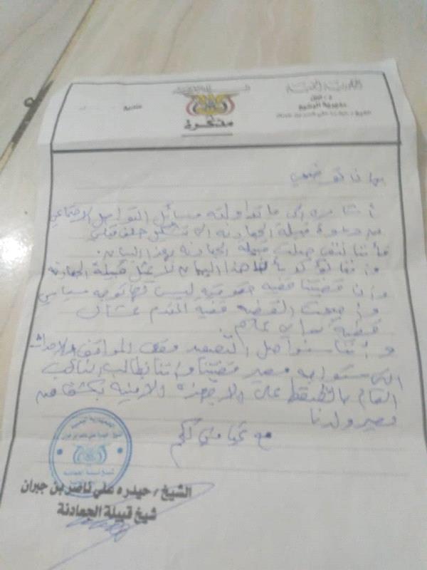 وأكد الشيخ حيدرة علي ناصر بن جبران بأن البيان المتداول لا يمثل قبيلة الجعادنة ، منوها إلى أن قضيتهم قضية حقوقية وأصبحت قضية رأي عام وليس لها توجه سياسي.