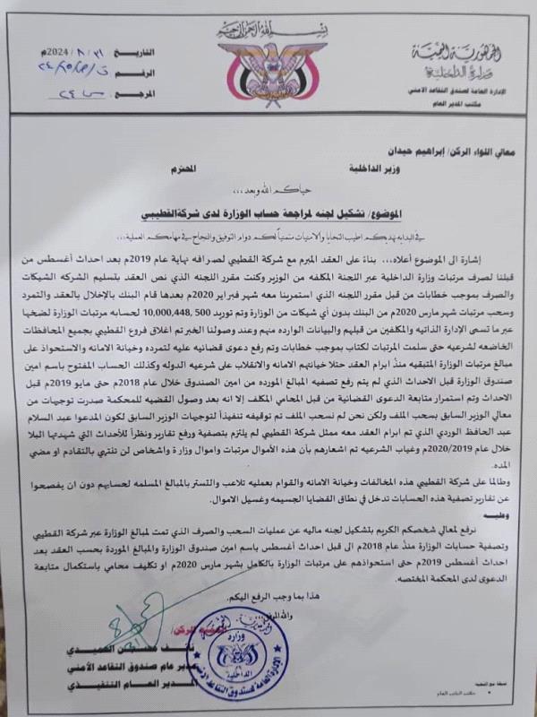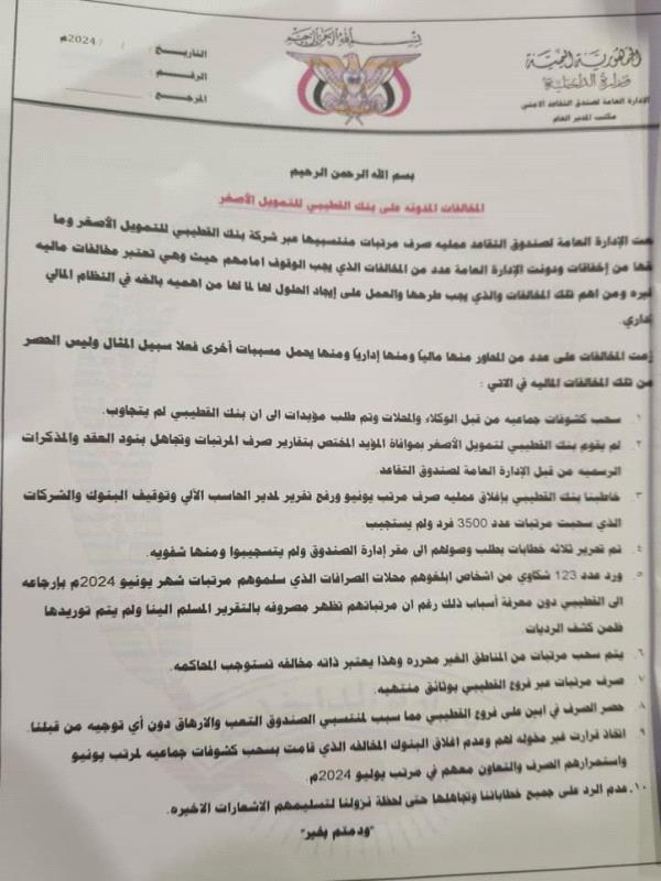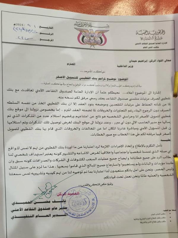 وأشارت إدارة التقاعد إلى أنها خاطبت بنك القطيبي بإغلاق عملية صرف معاش يونيو ورفع تقرير لمدير الحاسب الالي وتوقيف البنوك والشركات التي سحبت معاشات عدد ٣٥٠٠ فرد ولم يستجيب البنك لذلك ، لافتا إلى أنه تم تحرير ٣ خطابات بطلب وصولهم إلى مقر إدارة الصندوق ولم يستجيبوا ومنها شفوية، تم سحب معاشات في المناطق غير المحررة وهذه تعد مخالفة تستوجب المحاكمة ، وصرف معاشات عبر فروع القطيبي بوثائق منتهية ، حصر الصرف في ابين على فروع القطيبي مما سبب لمنتسبي الصندوق التعب والارهاق دون أي توجيه من قبلنا ، اتخاذ قرارات غير مخولة لهم وعدم اغلاق البنوك المخالفة التي قامت بحسب كشوفات جماعية للمعاشات يونيو واستمرارهم بصرف والتعاون معهم في معاشات يوليو ٢٠٢٤م.