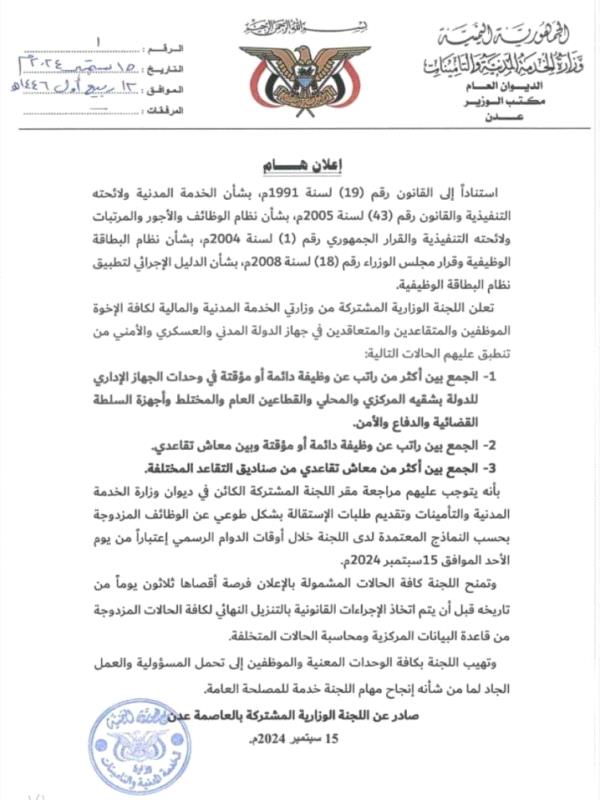 واهاب القرار بانه يتوجب على المشمولين بهذه الصفات التقدم بطلب الاستقالة الطوعية من الوظائف المزدوجة بحسب النموذج المعد من اللجنة المشتركة الى مقر اللجنة المشتركة الكائن بديوان عام وزارة الخدمة المدنية والتامينات عدن ابتداءً من يوم الاحد 15 سبتمبر 2024م.
