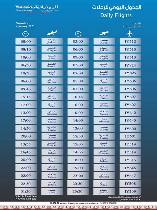 ✈️ #مواعيد_رحلات طيران اليمنية ليوم غدٍ السبت - 04 يناير 2025م