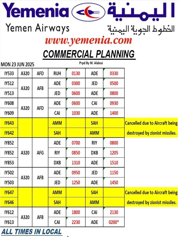 مواعيد رحلات طيران اليمنية ليوم الاثنين - 23 يونيو 2025م، كالآتي: