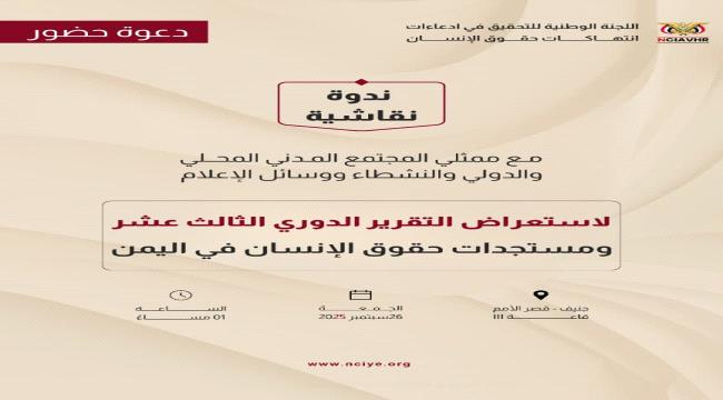 وقالت اللجنة في بلاغ صحفي، أنها ستنظم الجمعة 26 سبتمبر/أيلول الجاري، ندوة نقاشية، لاستعراض تقريرها الدوري الثالث عشر، ومستجدات حقوق الإنسان في اليمن.