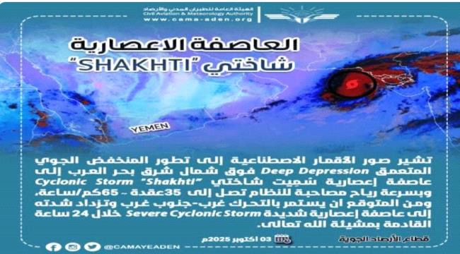 كشف مركز التنبؤات الجوية والإنذار المبكر التابع للهيئة العامة للطيران المدني والأرصاد، عن تطور المنخفض الجوي المتعمق Deep Depression فوق شمال شرق بحر العرب، إلى عاصفة إعصارية سُمِيت "شاختي" "Cyclonic Storm "Shakhti، وبسرعة رياح مصاحبة للنظام تصل إلى 35 عقدة ~ 65كم/ساعة، بحسب ما أشارت إليه صور الأقمار الاصطناعية.