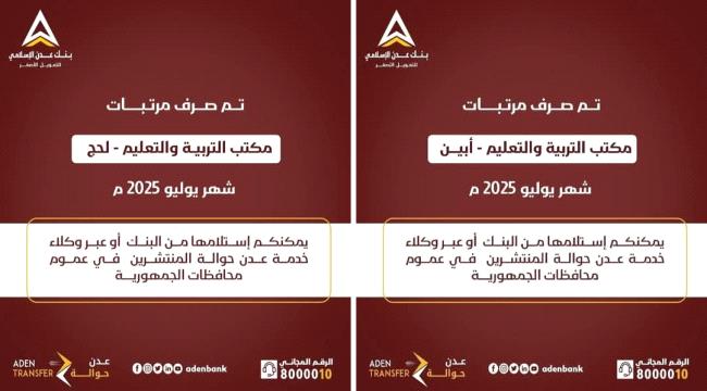بدء صرف مرتبات مكتب التربية والتعليم/ لحج و أبين لشهر يوليو 2025م عبر بنك عدن