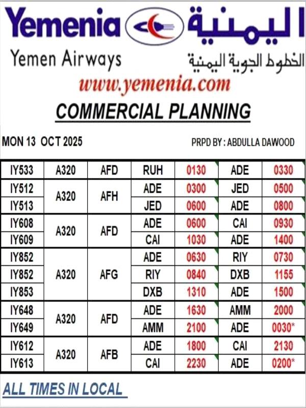مواعيد رحلات طيران اليمنية ليوم الاثنين - 13 أكتوبر 2025م
