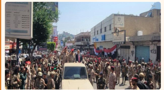 وشهد وزير الدفاع ومعه قائد المنطقة العسكرية الرابعة اللواء الركن فضل حسن، ورئيس هيئة الإسناد اللوجستي اللواء الركن عبد العزيز الفقيه، ونائب رئيس هيئة العمليات المشتركة اللواء الركن يوسف الشراجي، استعراضاً عسكرياً مهيباً قدمته وحدات محور تعز بمشاركة الأجهزة الأمنية في المحافظة، اظهرت من خلاله مستوى الانضباط والترتيب والجاهزية.