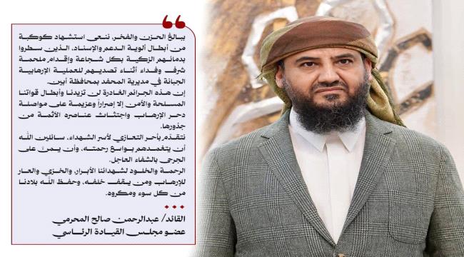 وأكد القائد المحرمي، في منشور له على صفحته الرسمية على مواقع التواصل الاجتماعي، أن الأبطال الشهداء "سطروا بدمائهم الزكية بكل شجاعة وإقدام ملحمة شرف وفداء أثناء تصديهم للعملية الإرهابية الجبانة".