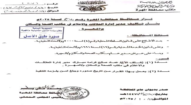 ونص القرار في مادته الأولى على تكليف المذكور مديراً لإدارة العلاقات العامة والإعلام بمكتب الصحة والسكان م/ المهرة.