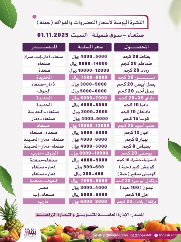 أسعار الخضروات والفواكه بالجملة والكيلو في سوق شميلة في صنعاء