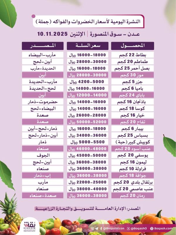 أسعار الخضروات والفواكه بسوق الجملة المنصورة في العاصمة عدن