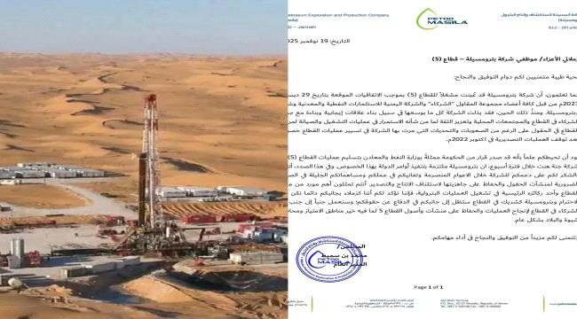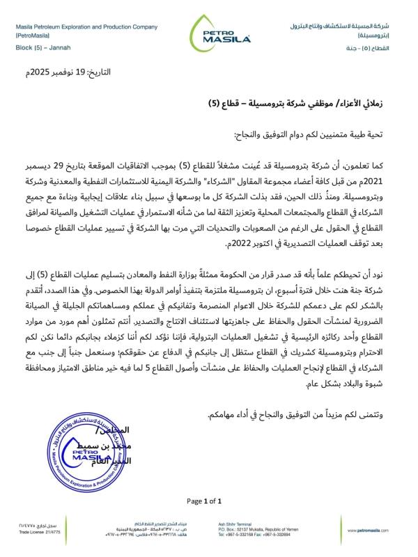 وقالت الشركة في تعميم داخلي موجه لموظفيها بتاريخ 19 نوفمبر 2025، إن بترومسيلة عُيّنت مشغلاً للقطاع بموجب الاتفاقيات الموقعة في 29 ديسمبر 2021 من قِبل جميع الشركاء، بما في ذلك الشركة اليمنية للاستثمارات النفطية والمعدنية، وشركة نيكو، وكوفبيك، وجنة هنت.