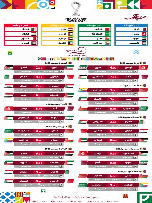 اليكم جدول مواعيد مباريات كأس العرب 2025 ، والتي تبدأ البطولة 1 ديسمبر ، والنهائي يوم 18 ديسمبر.
