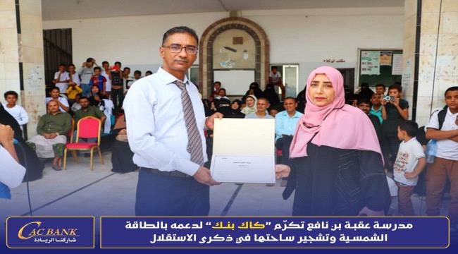 كرّمت مدرسة عقبة بن نافع، اليوم الخميس، بنك التسليف التعاوني والزراعي (كاك بنك)، وذلك ضمن فعاليات الاحتفاء بالذكرى الـ 58 لعيد الاستقلال الـ30 من نوفمبر، تقديرًا للدور الذي قدمه البنك في دعم المدرسة بنظام طاقة شمسية متكامل وتنفيذ عملية صيانة و تشجير واسعة لساحة المدرسة.