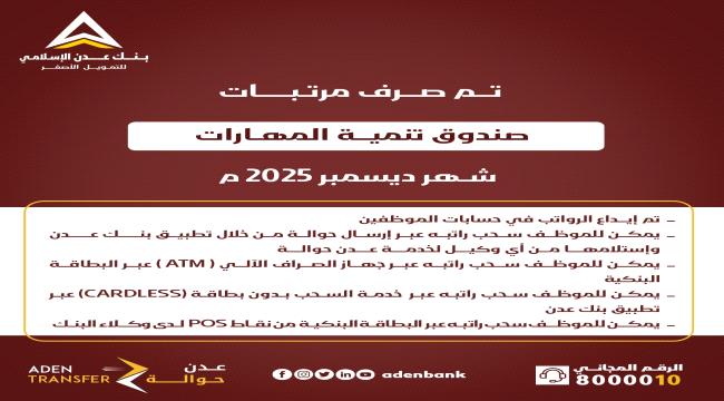 أعلن بنك عدن الإسلامي عن صرف مرتبات موظفي صندوق تنمية المهارات لشهر ديسمبر 2025م، مؤكداً أنه تم إيداع الرواتب في الحسابات البنكية للموظفين.