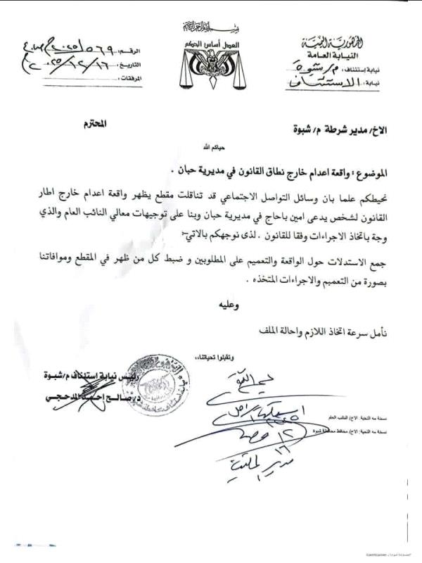 الجدير ذكره أن رئيس نيابة شبوة وجه مدير شرطة شبوة بالتعميم على المطلوبين وضبط كل من ظهر في المقطع الفيديو لحادثة الإعدام خارج عن القانون ، بناءً على توجيهات النائب العام.