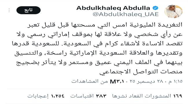 حذف مستشار رئيس دولة الإمارات العربية المتحدة، عبدالخالق عبدالله، ، تغريدته المسيئة للمملكة العربية السعودية، وقال إنها “رأي شخصي”.