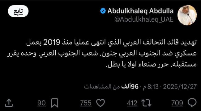 وأمس الأول السبت، قال مستشار رئيس الإمارات إن التحالف العربي لدعم الشرعية في اليمن انتهى عمليًا منذ عام 2019، مضيفًا: “تهديد قائد التحالف العربي، الذي انتهى عمليًا منذ 2019، بعمل عسكري ضد الجنوب العربي جنون”.