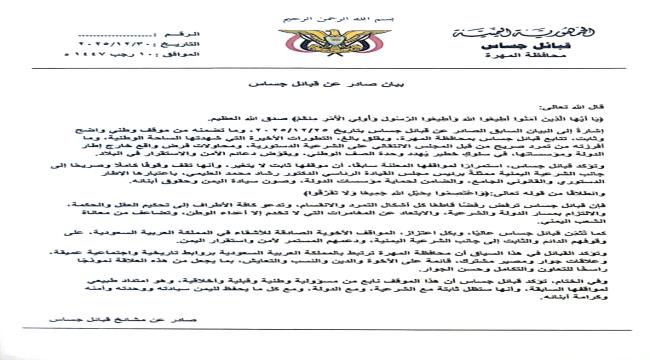 أصدرت قبائل جِساس بمحافظة المهرة بيانًا أكدت فيه تمسكها بموقفها الوطني الداعم للشرعية الدستورية، ورفضها القاطع لأي محاولات لفرض واقع خارج إطار الدولة ومؤسساتها، محذّرة من تداعيات السلوكيات التي تهدد وحدة الصف الوطني وتنعكس سلبًا على أمن واستقرار البلاد.