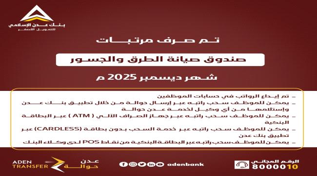 بدء صرف راتب ديسمبر 2025 لموظفي صندوق صيانة الطرق والجسور عبر بنك عدن الإسلامي