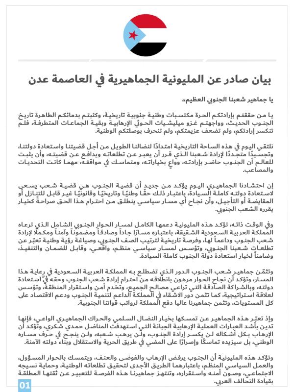وتؤكد هذه المليونية أن الجنوب يرفض الإرهاب والفوضى والعنف، ويتمسك بالحوار المسؤول، والعمل السياسي المنظم، باعتبارهما الطريق الأجدى لتحقيق تطلعاته الوطنية، وحماية نسيجه الاجتماعي، وصون أمنه واستقراره، وتنتهز جماهيرنا هذه الفرصة للتعبير عن ثقتها المطلقة بقيادة التحالف العربي.